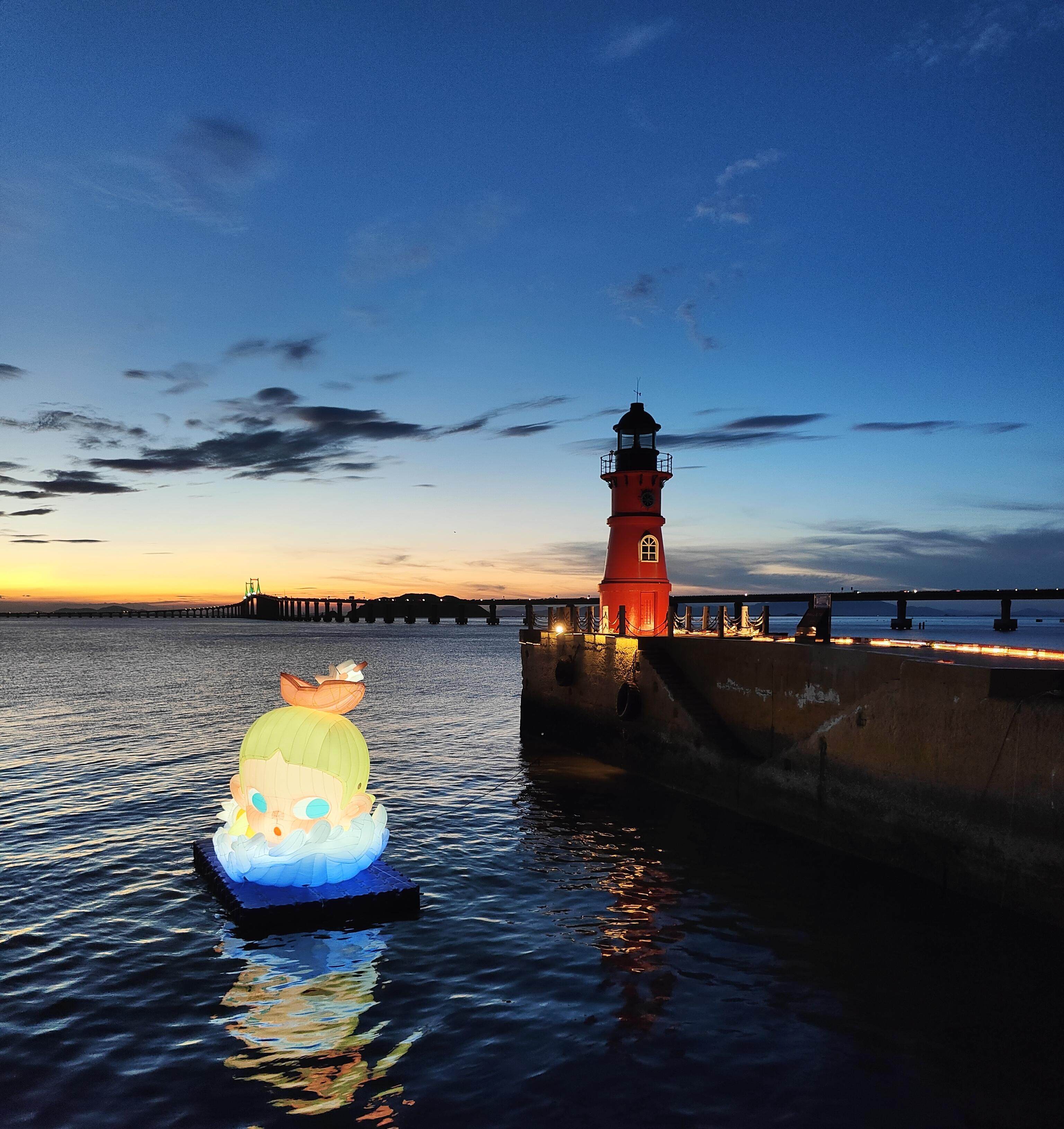 从旅程的起点——启航广场出发,一组装置“漂浮”海上,依偎着历史悠久的长山尾灯塔,面朝无垠大海“吹着浪花”;一组则坐落于广场草坪,与海风、灯塔构成治愈画面,仿佛正在“让风轻吻脸颊”,轻松定格海岛与潮玩交融的诗意瞬间。